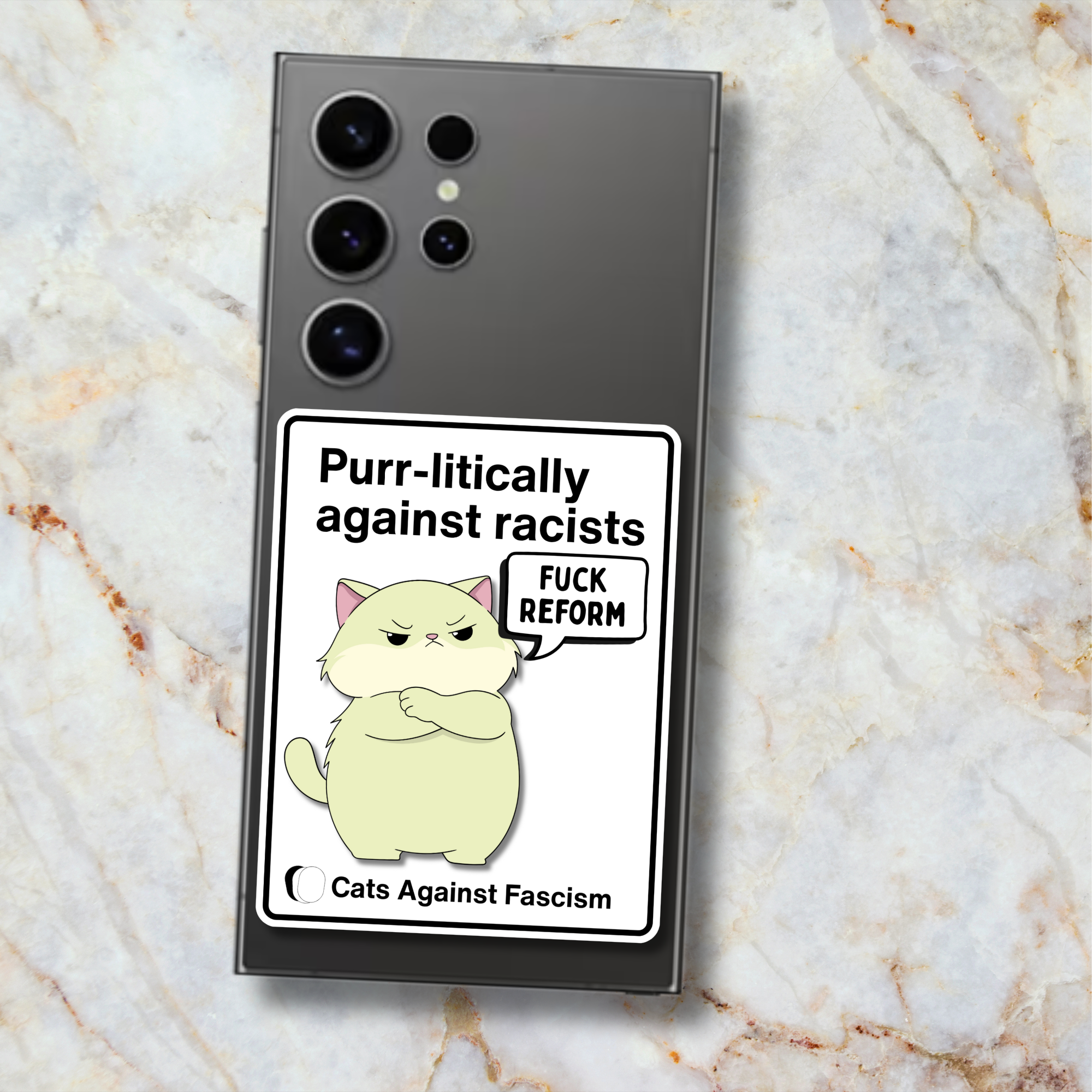 The Fuck Reform Cats Against Fascism Sticker is a reminder that politics is not just something that happens in parliaments and TV studios—it happens in everyday life, in art, in conversations, in the choices we make about what we wear, share, and display. This sticker is part of the Cats Against Fascism collection, where playful feline chaos meets anti-fascist resistance. Because sometimes the most powerful messages come wrapped in humour, glitter, and a chaotic cartoon cat.